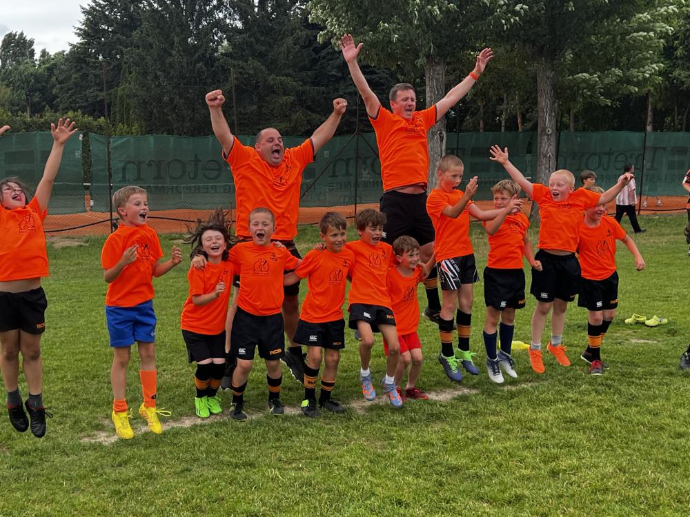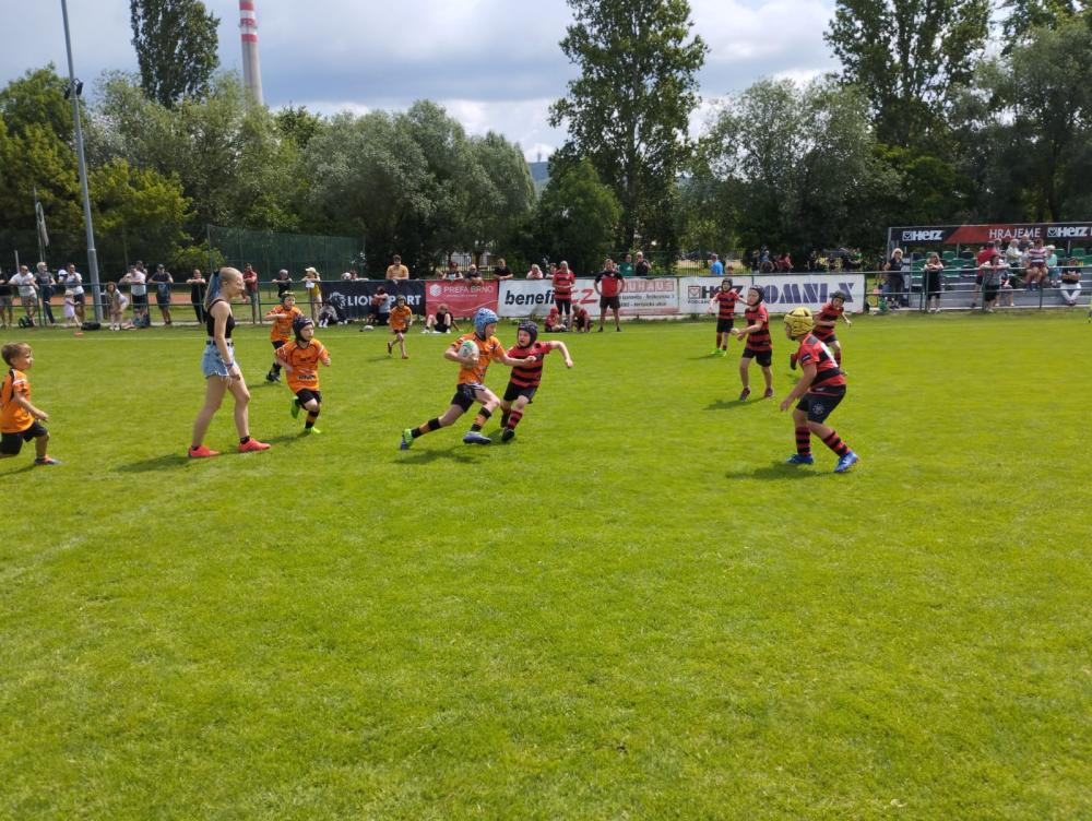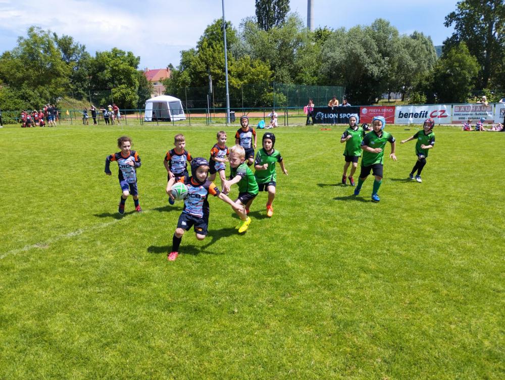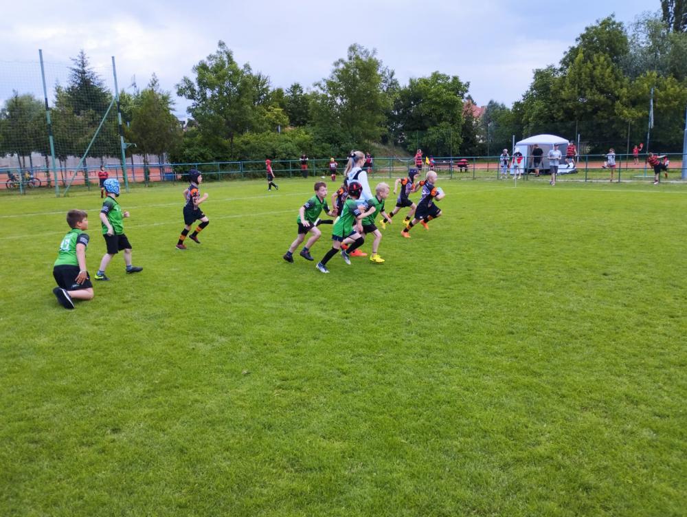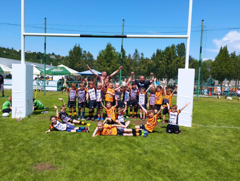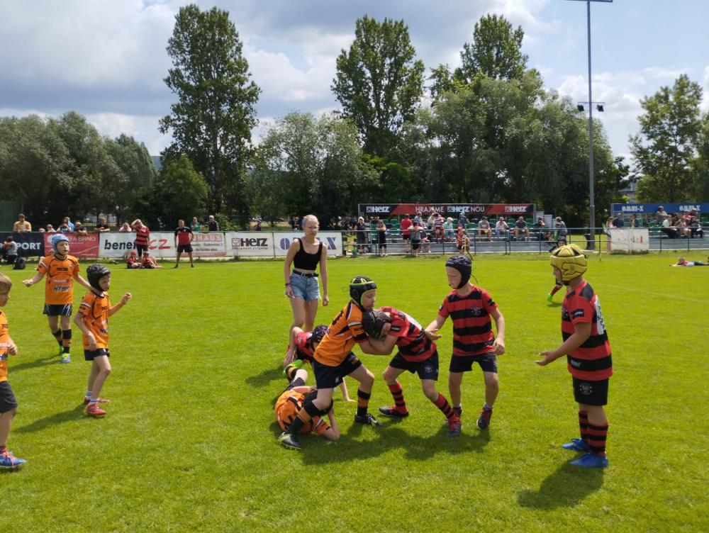 Oranžový tým postoupil líté boje taktéž, zvláště natěšení byli kluci z Olomouce. Až tak, že z nejmenovaných úst na lajně, poté co se skóre prvního utkání přehouplo do dvouciferné podoby v náš prospěch, zazněla hláška: "Vyčíhej si ho a dej mu na játra!" Gratulujeme, jednočlenná komise, jejímž předsedou je pisatel článku se jednohlasně shodla na tom, že tento výrok je hoden ocenění debilita roku a je zcela evidentní, že helmu by neměl nosit jen mazánek Janoušek. Nu což, občas i kalné vody člověk potká na pouti ragbyovým světem mládeže. Každopádně jsme na poslední turnaj opravdu postavili nejsilnější sestavu, i ti největší bombarďáci tak dostali možnost se rozloučit s osmičkovým dresem. A rozloučili se, jak jinak, parádním výkonem. Hráli jsme týmově, kreativně, tvrdě... stejně jako v celé sezóně se na to krásně dívalo.