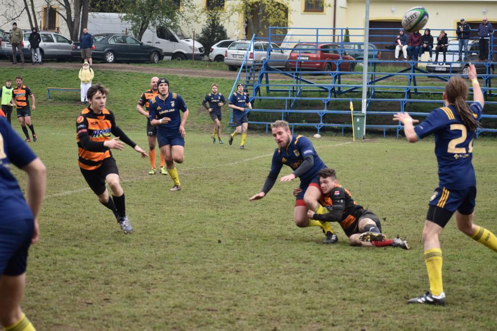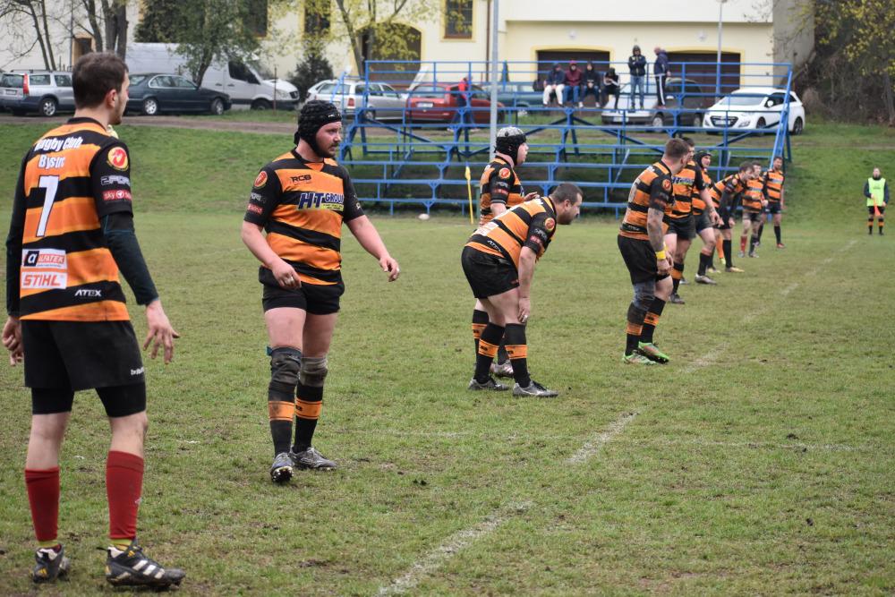 Od začátku bylo vidět, že hráči nechají na hřišti duši a nastavili vysoké tempo, což se hned ve 3. minutě zúročilo položením přes třičtvrtku a úspěšnou konverzí. Bohužel hned v zápětí nato dostáváme žlutou kartu a musíme hrát v oslabení. Místo, aby soupeř využil početní převahu, tlačí Bystrc, a to díky velmi organizované a tvrdé obraně. Soupeře prakticky nepouštíme k míči. Bohužel ve 20. min, po zaváhání, soupeř pokládá a srovnává stav. To ale RCB povzbudilo a hned pět minut poté dáváme body přes útokovou spojku, s podporou křídla na zavřené straně do petkoviště. Další ránou soupeře byl výpadutý balon a výborná práce tříčtvrtky, která hru sledovala, doběhla míč a tím jsme položili další body. Do konce prvního poločasu ještě Bystrc tlačí soupeře, ale stav už zůstává nezměněn - 26:7 pro Bystrc.
