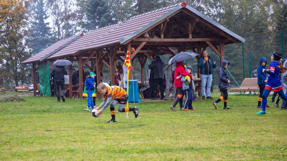 Rychle se převlékáme, rozcvička a jdeme na to. Do turnaje stavíme tentokrát jen jeden tým, protože předpověď počasí asi některé rodiče vyděsila. Zřejmě si budeme muset znovu připomenout, že déšť (ani ten kyselý:-)) nikdy nikoho historicky nerozpustil a termoprádlo, horký čaj a teplá sprcha po turnaji jsou dostatečné pomůcky, aby si děti mohly hru užít i když prší a je zima.
