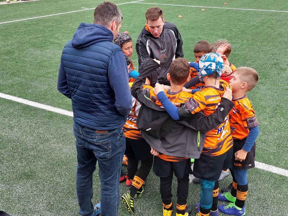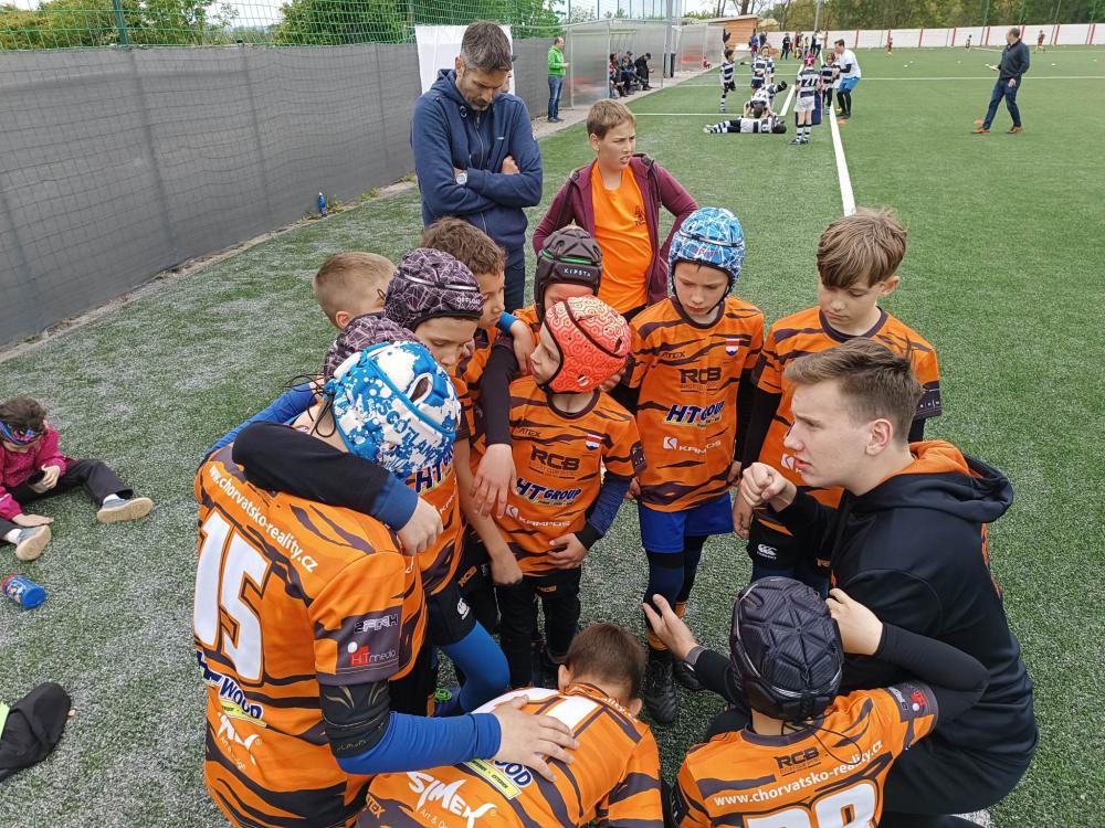 Už při rozcvičce bylo znát, že se hráči těší na den plný rugby. Na trenérské schůzi jsme zjistili, že se (asi nově) v kategorii U10 může zdvojovat. Což nám pomohlo, protože jsme nemuseli objemnější hráče a hráčky skládat jen v jednom za nohy a doufat, že se uvolí spadnout.