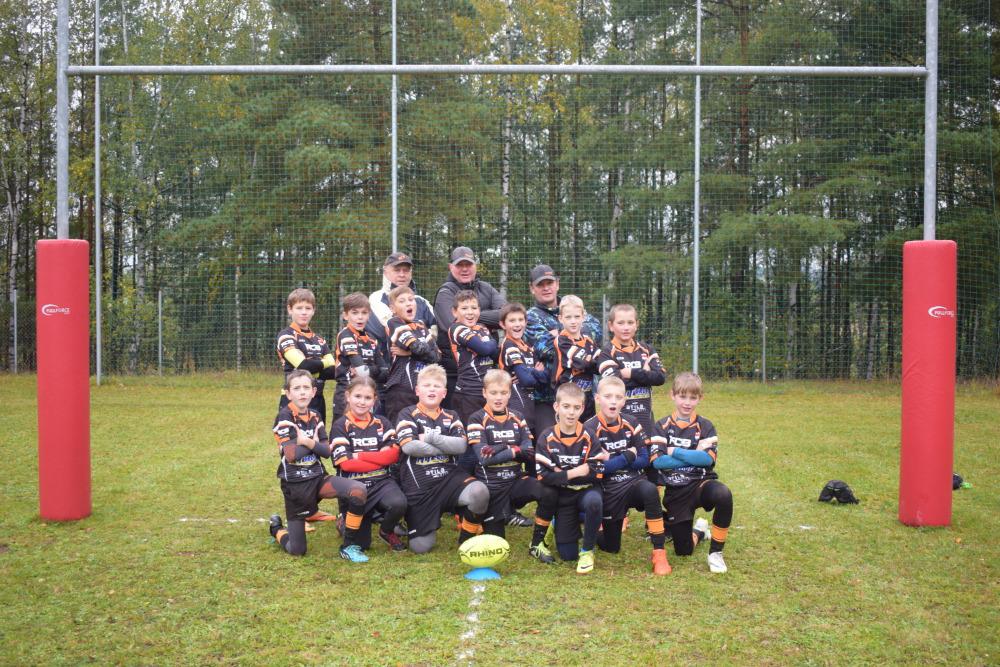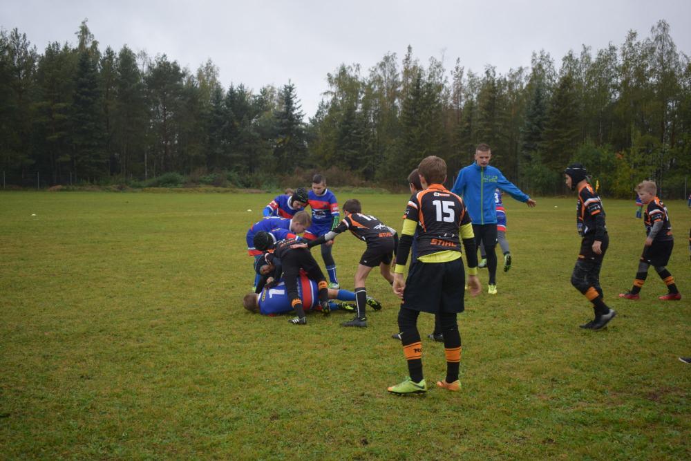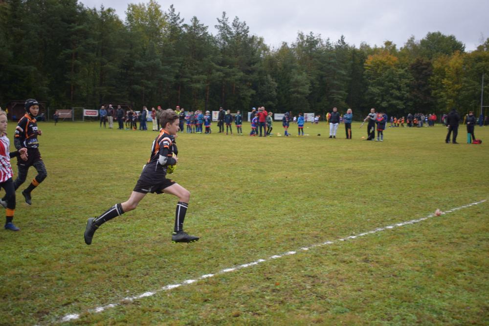 Pro nemoc nám chyběl Jindra a jeho kapitánskou pásku převzal Denis. Chyběli také další hráči, hlavně rojníci: Renda, Peří, také Kristýnka nebo Messi. K našemu překvapení se ředitel turnaje s dalšími oddíly (Dragon a Vyškov) dohodl na hře o 12i hráčích, aby děti nestáli na střídačkách, nikoliv k radosti našeho trenérského triumvirátu. Takže po rychlém vysvětlení hráčům, jak se má vázat druhá řada v mlýnech a kde stát v autu, jsme šli rovnou do zápasu. Hřiště bylo přehuštěné hráči a naši „bombarďáci“ útočníci nenacházeli prostor pro svoje úniky. Pozdě jsme vybíhali do obrany, nedrželi jsme rovinu a dělali zuby. Rojníci se spíše potulovali po hřišti a často se nacházeli v prostoru mezi spojkami, kde bránili vlastní rozehrávce, nebo si hledali místo v útoku. Dragonu se podařilo položit pětku, na kterou jsme nedokázali odpovědět. Utkání tedy skončili 0:1.