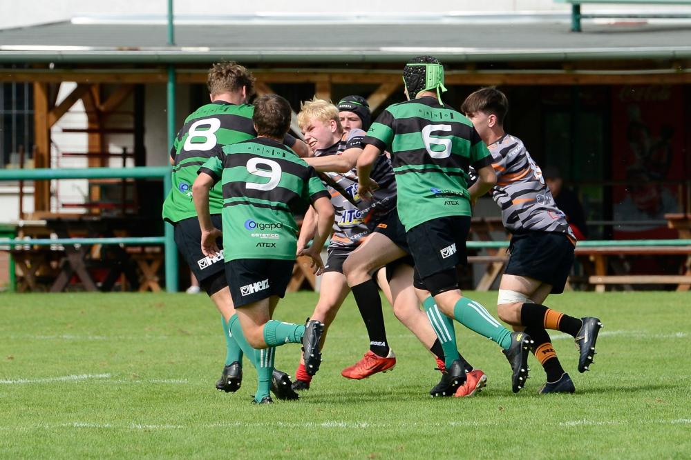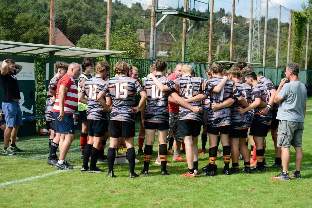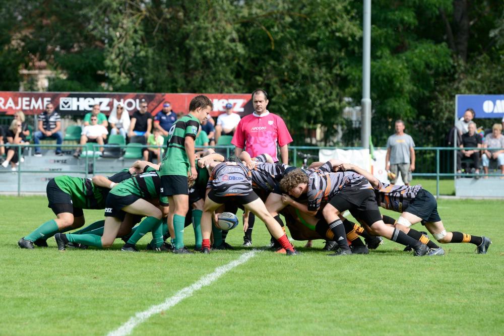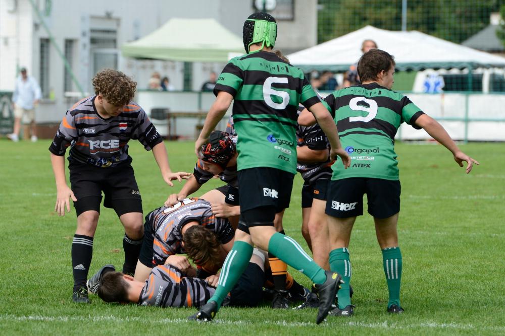 Dále byla vidět tvrdá rojová hra soupeře, ale kluci poctivě bránili až do 23. minuty, kdy soupeř protlačil rojem míč až do pětkoviště, následnou úspěšnou konverzí otočili domácí stav na 7:5. Kluci hráli proti silnějšímu soupeři hlavně srdcem a nenechali se strhnout rohovou hrou soupeře. Naopak jsme opět rozhodili rychle míč přes útok a Janek Svrčina položil svou druhou pětku, Ondra byl bohužel opět neúspěšný s konverzí.